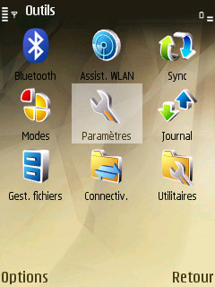 Bluetooth / Assistant WLAN / Sync / Modes / Paramètres / gestionnaires fichiers / Connectivité / Utilitaires / Téléchargez! / Bienvenue / Centre vidéo / Appareil photo / RealPlayer / Flash / Aide / À propos