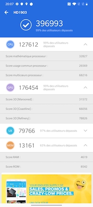 Deuxième changement : la plate-forme. Nous passons à un Snapdragon 855+ avec 8 Go de RAM minimum. Cela veut dire plus de puissance sous le capot. Plus de fluidité pour les applications gourmandes. Cette nouvelle combinaison offre évidemment de beaux résultats sur les benchmarks. Vous retrouvez quelques résultats ci-dessous. Toujours côté chiffres et tests techniques, l?écran du OnePlus 7T offre quelques améliorations.