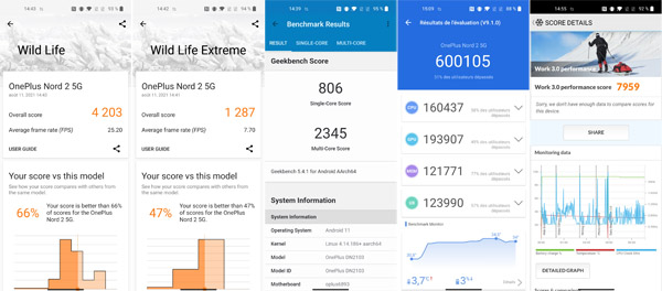Alors que le Nord propose un Soc Snapdragon 765G de milieu de gamme, le Nord 2 profite de la puce Mediatek Dimensity 1200-AI, une version optimisée par les équipes de OnePlus pour ce mobile. Le fabricant promet ainsi des améliorations « significatives » dans les domaines de la photo, de l?écran, le jeu vidéo et les couleurs du système. Pour la photo, le processeur aide à la reconnaissance des scènes qui sont présentées devant l'objectif. Pour les jeux vidéo, c'est la consommation qui est optimisée afin de réduire jusqu?à 10% les ressources nécessaires tout en conservant, selon le constructeur, une fluidité et une jouabilité équivalente. L'amélioration de la netteté d'image vidéo et des couleurs évoquée plus haut fait également partie de ces optimisations alors que le quatrième point doit mieux gérer les couleurs du système. Dans les faits, il est difficile de mesurer précisément l'apport de cette intelligence artificielle poussée, mais, globalement, on a droit à un mobile qui se montre fluide et qui sait répondre à toutes les sollicitations quotidiennes auxquelles on peut le soumettre. Même après plusieurs longues minutes de tests stressant pour la puce principale, le mobile reste tout à fait tempéré ce qui est toujours une bonne chose. Par rapport à son prédécesseur, le Nord 2 fait mieux, bien mieux. Comme les autres, nous l'avons soumis à plusieurs outils de mesure de performances afin d?évaluer ses capacités. En voici les principaux résultats.