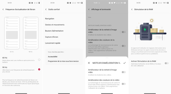 À ce propos, il faut bien entrer dans les menus pour accéder à la fonction de fréquence d'actualisation ce qui est, selon nous, un peu fastidieux surtout si on veut passer de l'un à l'autre rapidement. Comme ses prédécesseurs, il n'y a pas de mode HDR pour optimiser les zones sombres. À l'image de tous les autres smartphones, la luminosité, elle, peut s'adapter selon les conditions d?éclairage ambiant. Un mode confort des yeux est disponible ainsi que la possibilité d?éteindre l?écran automatiquement au bout d'un certain temps à définir. Si on peut jouer avec la température des couleurs affichées en déplaçant un curseur de froid à chaud, il est également possible de modifier le mode de couleurs entre vif et doux. À l'usage, nous n'avons éprouvé aucune difficulté à utiliser le mobile en extérieur et même en plein soleil, la luminosité étant suffisante pour un tel exercice même si nous avons déjà vu des écrans plus lumineux que celui-ci et pas nécessairement chez OnePlus. Notez la présence d'un moteur d'amélioration des vidéos concernant la netteté et les couleurs grâce à une technologie de reconnaissance des scènes par intelligence artificielle pour proposer des rendus optimaux.