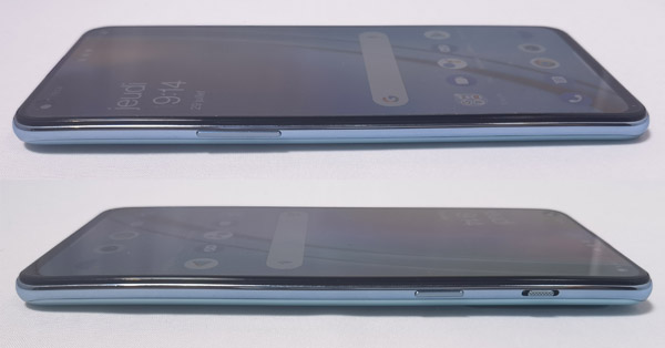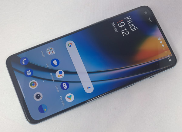 La façade du OnePlus Nord 2 est classique avec des bords assez fins sur les côtés et en haut, mais plus épais dans la partie basse de la surface d'affichage. Il y a un poinçon dans le coin supérieur gauche qui permet d'abriter le capteur photo frontal pour se prendre en selfie. Pour s'identifier et déverrouiller le Nord 2, il y a un lecteur d'empreinte digitale installé sous l?écran. Comme sur le OnePlus 9 et le OnePlus 9 Pro, mais également d'autres mobiles d'autres marques, il est, selon nous, placé trop bas, laissant seulement 1,5 cm d'espace entre le bord du smartphone et sa partie basse. Nous préférons une position plus haute à l'image de celle proposée par le Huawei Mate 40 Pro ou le Xiaomi Mi 11, par exemple.
