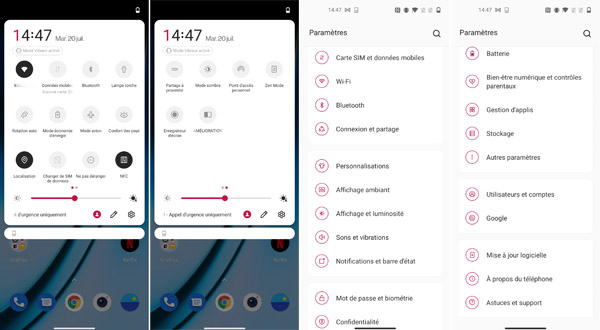 Le Nord 2 s'appuie sur le système Android 11 avec la surcouche OxygenOS ici proposée en version 11.3. Il s'agit d'une mouture particulièrement agréable à utiliser au quotidien et qui ne change pas (trop) les habitudes si on a déjà eu un mobile de la marque entre les mains. « Pas trop » car il faut tout de même reconnaître que certains menus, notamment dans les paramètres, sont légèrement différents de ceux que l'on trouve, par exemple au sein des OnePlus 9 et OnePlus 9 Pro, par exemple. On apprécie le fait de ne pas avoir d'applications préinstallées autres que celles de Google mis à part Clone Phone pour cloner les données d'un précédent smartphone, Community, un raccourci pour accéder à la communauté du fabricant ainsi qu'une application Zen Mode qui permet d?écouter des sons relaxants à certains moments de la journée pour se décontracter et laisser son mobile de côté.