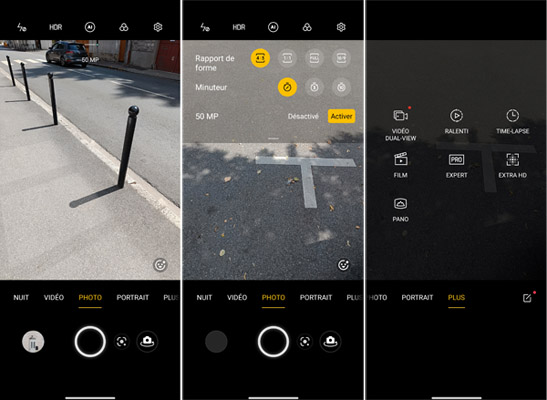 L'interface de l'application Camera est très classique. On peut tirer un panneau d'options depuis le haut de l?écran afin de définir le rapport de forme, le minuteur ou activer le mode 50 MP (mégapixels) ce qui rendra le zoom inactif. Les modes immédiatement disponibles sont : Nuit, Vidéo, Photo, Portrait et Plus. Ce dernier cache les modes Vidéo double vue, Ralenti, Time-lapse, Film, Extra HD, Pano (ramique) et Expert. Notez la possibilité de personnaliser les modes accessibles afin que chacun puisse trouver rapidement celui ou ceux qu'il utilise le plus souvent.