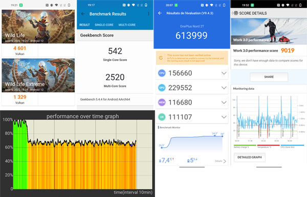 Nous n’avons pas constaté de ralentissement lors de nos tests. Face à la concurrence, il s’avère plus performant notamment que le Samsung Galaxy A53 5G (Exynos 1280), Oppo Reno8 Lite et Sony Xperia 10 IV (Snapdragon 695), Xiaomi Redmi Note 11 Pro+ 5G (Dimensity 920), Nothing phone (1) (Snapdragon 778G+). Seul le Google Pixel 6a s’en sort mieux avec son chipset Tensor. Remarquez le graphique proposé par l’application CPU Throttling Test qui montre que le chipset installé à bord du OnePlus Nord 2T 5G livre ses meilleures performances pendant les 7 premières minutes puis chute à 70% pour limiter la surchauffe.