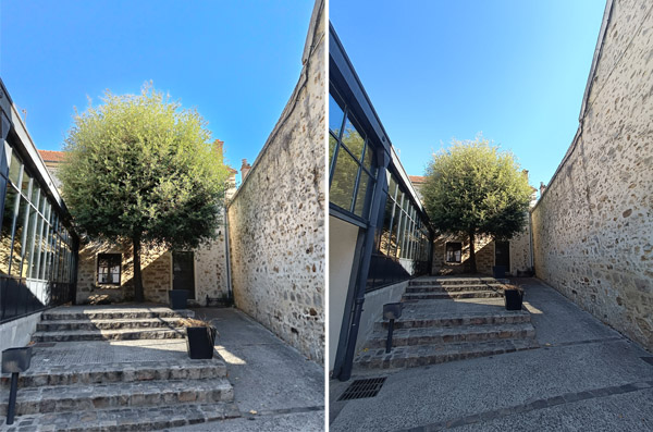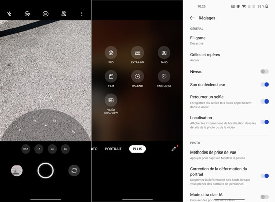 L’interface de l’application Appareil photo est assez classique. On dispose de quelques options depuis le haut de l’écran afin de définir le rapport de forme, le minuteur ou activer l’intelligence artificielle ainsi que le mode 50 MP (mégapixels) ce qui rendra le zoom inactif. Les modes immédiatement disponibles sont : Nuit, Vidéo, Photo, Portrait et Plus. Ce dernier abrite les modes Pro, Extra HD, Pano (ramique), Film, Ralenti, Time-lapse et Vidéo double vue. Notez la possibilité de personnaliser les modes accessibles afin que chacun puisse trouver rapidement celui ou ceux qu’il utilise le plus souvent.