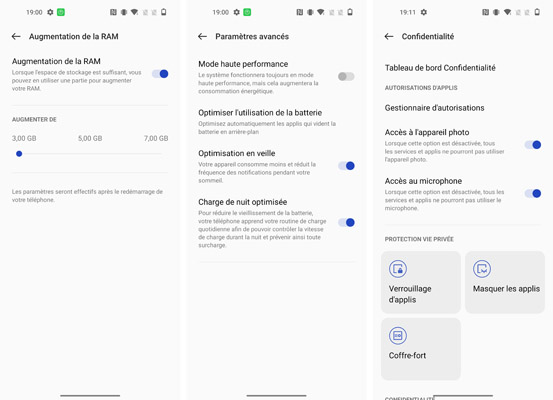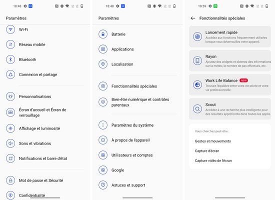 Le niveau de personnalisation est toujours aussi poussé avec de nombreuses possibilités de configuration, selon ses propres goûts. La navigation par gestes est de mise ainsi qu’un raccourci vers l’application Camera en appuyant deux fois rapidement sur le bouton d’alimentation ou en y associant une autre fonction, le cas échéant. Parmi les fonctionnalités spéciales, il est possible d’activer une zone de lancement rapide pour certaines applications directement depuis le lecteur d’empreinte. On trouve également le panneau Self (appelé Rayon dans les paramètres) qui permet de regrouper plusieurs widgets sur un seul panneau accessible depuis le coin supérieur droit.