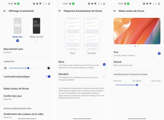 L’écran du OnePlus Nord 2T 5G dispose d’une fréquence de rafraîchissement de 90 Hz, comme le OnePlus Nord 2 là où les Samsung Galaxy A53 5G, Nothing phone (1), realme GT Neo 2 et Xiaomi Redmi Note 11 Pro + 5G proposent 120 Hz. Le mobile Google Pixel 6a propose seulement 60 Hz, comme le Oppo Reno8 Lite, un autre concurrent. La fréquence n’est pas adaptative dans le sens où c’est l’utilisateur qui définit à 60 ou à 90 Hz manuellement depuis les paramètres de l’appareil. La luminosité offerte par la dalle installée sur le OnePlus Nord 2T 5G est suffisante pour s’en servir en extérieur, même en plein soleil même s’il préfère de loin les environnements plus sombres. Dans la pénombre, il offre un rétroéclairage tout à fait satisfaisant. On apprécie toujours autant la profondeur des noirs de la dalle AMOLED et la belle reproduction des couleurs. Comme tous les autres smartphones, la luminosité, elle, peut s’adapter selon les conditions d’éclairage ambiant. Un mode confort des yeux est disponible ainsi que la possibilité d’éteindre l’écran automatiquement au bout d’un certain temps à définir. Si on peut jouer avec la température des couleurs affichées en déplaçant un curseur de froid à chaud, il est également possible de modifier le mode de couleurs entre vif et naturel. Notez la présence d’un moteur d’amélioration des vidéos concernant les couleurs grâce à une technologie de reconnaissance des scènes par intelligence artificielle pour proposer des rendus optimaux.