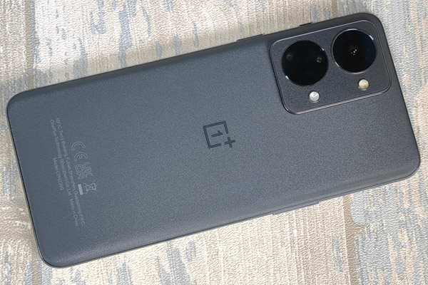 Le dos de l’appareil est en plastique avec un toucher extrêmement agréable au toucher. Le smartphone est décliné en noir (gray shadow) ou en vert (jade fog). C’est la première finition que nous avons pu tester. La coque arrière est lisse, légèrement brillante, mais pas trop et traitée anti-traces de doigts, un principe très efficace sur ce modèle. Au milieu, le logo OnePlus est constitué d’un autre revêtement non glissant.
