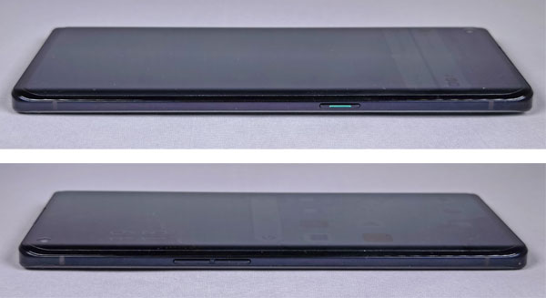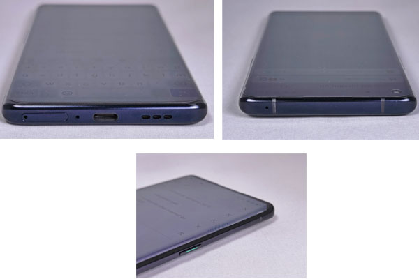 On a droit aux boutons classiques avec une petite marque verte sur le bouton d'alimentation. Il n'y a pas de connecteur audio jack 3,5 mm. Le tiroir à carte SIM en supporte une seule alors que le Oppo Reno4 Pro peut en accueillir deux simultanément, mais n'accepte pas, comme le Find X2 Neo, d'extension pour accroitre la capacité de stockage. Dommage. Notez qu'il dispose toute de même de 256 Go d'espace mémoire interne ce qui laisse tout de même voir venir. Le dos profite d'un très beau revêtement qui laisse quelques traces de doigt et prend bien la lumière offrant quelques reflets, selon les inclinaisons qu'il peut prendre. Dans le coin supérieur, à gauche, il y a le bloc optique avec les capteurs alignés dans le sens vertical intégrant aussi le flash. On apprécie la compacité du module qui reste plutôt discret alors qu'il contient tout de même 4 capteurs et un flash. Sur d'autres appareils, l'intégration est plus cavalière et le bloc optique est bien plus large pour le même nombre d'objectifs.