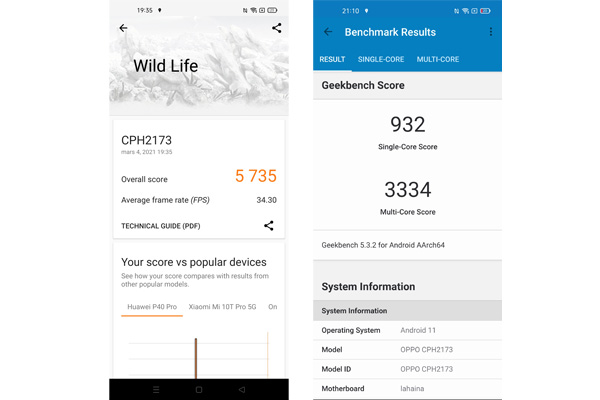 Pour son modèle le plus haut de gamme, Oppo n'a pas pu faire d'autre choix que d'intégrer la puce Qualcomm Snapdragon 888 qui est ici associée à 12 Go de RAM, comme sur le précédent modèle. La mémoire de 256 Go est au format UFS 3.1 pour des écritures et des lectures de données extrêmement rapides. On rappelle l'impossibilité d?étendre la capacité de stockage. Avec une telle plateforme, autant dire que les applications sont lancées avec une très grande vitesse et on passe de l'une à l'autre en moins de temps qu'il n'en faut pour le dire. Aucune application ni jeu ne lui résiste. Tout est exécuté avec une incroyable fluidité. Le 120 Hz est un plus pour les jeux dans lesquels le niveau maximum de détails peut tout à fait être activé sans saccade.
