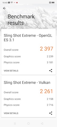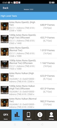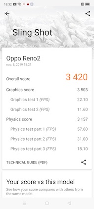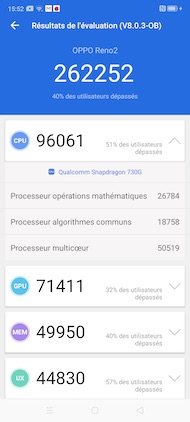 Du point de vue des performances, le Snapdragon 730G, accompagné de 8 Go de RAM, offre des performances dignes du segment premium : suffisant pour tous les usages, mais un peu en dessous de ce qu'attendraient des utilisateurs chevronnés. Sans trop de surprise, le Snapdragon 730G se positionne en dessous des chipsets haut de gamme comme le Snapdragon 855 et le Kirin 980, mais au-dessus des Snapdragon 6XX. Que ce soit dans les tests destinés aux processeurs, au processeur graphique ou à un mix des deux. Vous trouverez ci-dessus quelques exemples de résultats obtenus avec le smartphone sur AnTuTu, Geekbench, 3Dmark ou GFXBench.