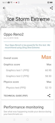 En multimédia, le Reno 2 offre une expérience assez proche de celle du Reno. D'abord parce que le Snapdragon 730G, accompagné des 8 Go de RAM, offre une bonne fluidité aux jeux que vous trouverez sur le Play Store, même ceux qui utilisent un moteur 3D. Notre jeu étalon Dead Trigger 2 s'est très bien comporté, affichant de lui-même la meilleure qualité graphique (avec un taux de rafraîchissement à 61 images par seconde précisément). Les séquences de jeux ont été fluides. Notez que des bandes noires apparaissent à cause du ratio de l?écran. Ce n'est pas exclusif au Reno 2. Mais il en est malheureusement victime.