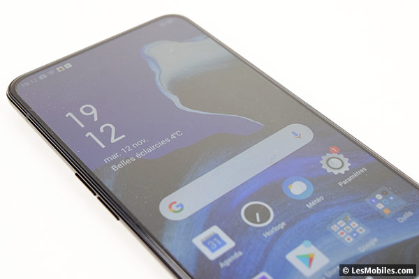La diagonale de l?écran du Reno 2 atteint 6,5 pouces. Soit 0,1 pouce de plus que celle du Reno. L?écran n'est pas plus large, mais un peu plus haut. Son ratio passe de 19,5/9e à 20/9e. Ce qui explique que la résolution ne baisse pas grâce à l'ajout de pixels en hauteur. La dalle est AMOLED, offrant des taux de contraste infinis et de belles couleurs que le Reno 2 restitue bien. La luminosité maximale est de 500 candelas, ce qui est largement suffisant pour assurer une bonne lisibilité en plein jour.