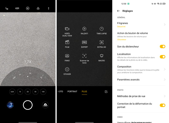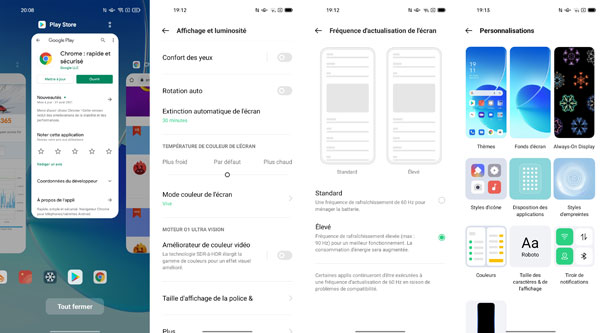 Les paramètres permettent de modifier la température des couleurs et de choisir parmi le mode vif ou le doux celui qui correspond le mieux aux attentes de l'utilisateur. Un module d'optimisation des couleurs est également disponible, O1 Ultra Vision, si nécessaire. Puisque l?écran est capable d'afficher une fréquence de rafraîchissement de 90 Hz, il est possible de choisir entre celle-ci ou de rester à 60 Hz. C'est l'un ou l'autre, n'ayant pas de fonction automatique disponible. Dans le premier cas, les défilements des sites et des pages des réseaux sociaux s'avèrent plus fluides, mais la consommation de la batterie est plus importante. Dans le deuxième cas, les défilements sont moins agréables, mais l'autonomie est meilleure. Un compromis est à faire même si, nous le verrons, l'autonomie de l'appareil est suffisante en restant sur le mode 90 Hz.