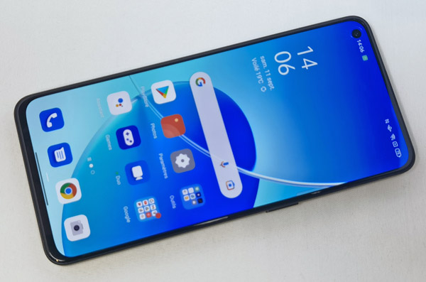 L?écran du smartphone Oppo Reno6 occupe une très grande partie en façade avec des bords particulièrement fins surtout sur les côtés et en haut. C'est un peu moins le cas sur la partie inférieure, mais c'est vraiment très raisonnable. La symétrie est très bonne et on a une belle impression de toute la surface d'affichage qui n'a qu'un poinçon dans le coin supérieur gauche pour laisser de la place au capteur photo frontal. Il s'agit d'une dalle AMOLED de 6,43 pouces affichant une définition de 1080x2400 pixels, comme sur le OnePlus Nord 2 qui propose aussi la même fréquence de rafraîchissement de 90 Hz et comme sur le realme GT Master Edition mais qui lui, peut monter jusqu?à 120 Hz. La luminosité offerte est suffisante en pleine journée au soleil. Elle l'est également dans l'obscurité à son plus faible niveau permettant, malgré tout, de voir correctement.