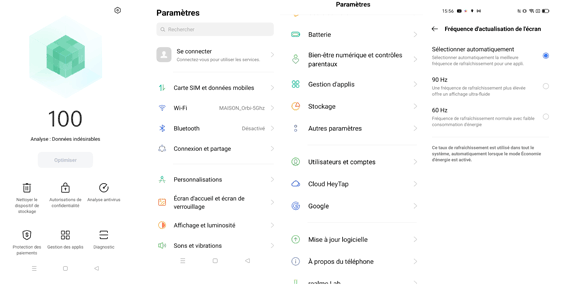 Même remarque que lors de notre test du Redmi Note 10 5G, pour quelques dizaines d'euros de plus, le Poco F3, aussi compatible 5G (et même Wi-Fi 6) propose une autre qualité : dalle AMOLED 120 Hz sur 6,67 pouces en diagonale ayant une définition de 1080x2400 pixels et surtout une compatibilité avec la norme HDR10+. D'autant que comme sur le mobile Xiaomi, le realme 8 5G a un peu de mal en extérieur surtout en plein soleil proposant une luminosité légèrement faible dans ces conditions. Dans les paramètres, il est possible d'activer la fonction de confort des yeux, de pencher vers une température de couleurs plus ou moins chaude, d'appliquer la fonction Effet visuel OSIE pour optimiser les contenus de faible définition et de choisir entre des couleurs vives ou douces. Notez également la possibilité de bloquer la fréquence sur 60 Hz ou 90 Hz pour des raisons d?économie d?énergie, par exemple, ou de laisser le mobile sélectionner automatiquement la fréquence la plus adaptée à l'application en cours d'exécution.