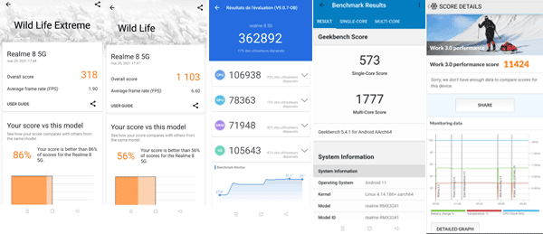 Là encore, le realme 8 5G partage la même plateforme que le Redmi Note 10 5G et que le Poco M3 Pro. Ils s'appuient sur un processeur Mediatek Dimensity 700 avec 4 ou 6 Go de mémoire vive. Notez que notre modèle de test prêté par la marque embarquait 8 Go de RAM. La mémoire interne est au format UFS 2.1 et d'une capacité de 64 ou 128 Go, selon la version choisie. Rappelons que cette mémoire interne peut être étendue jusqu?à 1 To avec une carte idoine. Cette plateforme permet d'offrir une fonction 5G et un prix abordable. Toutefois, elle offre des performances plutôt moyennes impliquant, par exemple, le passage d'une application à une autre avec une petite latence. Le lancement de certaines d'entre elles peut aussi être un peu lent parfois. Pour le jeu, il faut se limiter aux parties ludiques usuelles car impossible de jouer dans de bonnes conditions de fluidité sur les jeux les plus exigeants.
