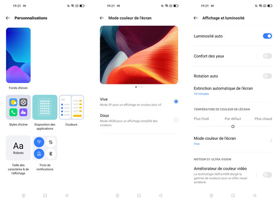 La fréquence est réglable sur 60 ou 120 Hz et peut varier automatiquement entre les deux selon les applications utilisées. C'est ce que l'on pourrait appeler du semi-adaptatif vu qu'il n'y a pas de palier entre les valeurs proposées. La dalle IPS de l?écran du realme 8i est percée dans le coin supérieur gauche pour le capteur photo frontal. Elle propose une luminosité assez élevée, ce qui autorise un usage en extérieur sans avoir trop de problèmes. Notez qu'il est possible de jouer sur la température des couleurs pour un côté plus chaud ou plus froid. On peut également choisir entre le mode Vif ou doux et activer l'optimisateur de couleur pour les vidéos. Un mode confort des yeux est également disponible. La fréquence 120 Hz apporte effectivement un plus, mais le contraste est moindre puisqu'utilisant une dalle LCD.