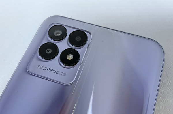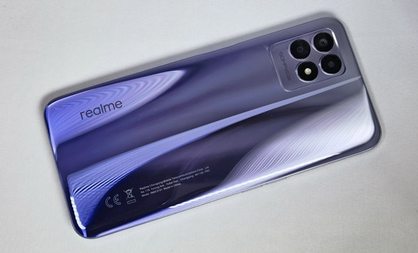 Le smartphone realme 8i propose un design qui ressemble en tous points au realme 8. Il est recouvert d'une coque en plastique particulièrement brillante qui ne laisse aucune chance aux traces de doigts. Le fabricant livre une coque en silicone pour le protéger immédiatement en sortie de boîte. L'appareil propose des proportions dans la moyenne des smartphones. Il fait 164,5 mm de haut pour 75,5 mm de large et 8,5 mm d?épaisseur avec un poids de 194 grammes sur la balance. Le realme 8i est ainsi un peu plus grand et un peu plus lourd que le realme 8. Le dos du realme 8i reflète donc la moindre source de lumière qui se pose sur lui. Il y a le bloc optique dans le coin supérieur gauche qui se présente sous la forme d'un rectangle avec 4 cercles intégrant les 3 capteurs photo et le flash LED. Ils ont le même diamètre, ce qui confère une belle symétrie de l'ensemble.