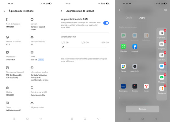 Comme les autres smartphones de la marque, le realme 8i embarque Android 11 avec une surcouche logicielle realme UI. Il s'agit de la même interface et des mêmes fonctionnalités que nous avons pu voir au sein du realme GT Master Edition, par exemple ou realme 8 5G. Celle-ci est assez proche de la surcouche ColorOS utilisée sur les smartphones Oppo et bientôt aussi sur les OnePlus. Realme UI propose de nombreuses options de personnalisation. Il est possible de changer les fonds d?écran, d'appliquer différents thèmes, de modifier les styles d'icônes, les styles d'empreintes digitales, les couleurs, l'apparence du tiroir des notifications ou encore les couleurs d?éclairage sur les bords pour voir lorsqu'une notification arrive. Notez aussi la présence d'une barre latérale pour y placer des raccourcis vers certaines applications afin d'y accéder beaucoup plus rapidement. Le gestionnaire d'application est assez classique. On peut passer de l'une à l'autre d'un glissement de doigt, en verrouiller une ou scinder l?écran en deux pour afficher deux applications en même temps afin d?être plus productif. Plusieurs options de confort sont disponibles concernant la navigation (gestuelle ou à partir des boutons virtuels), les gestes pour faire une capture d?écran, pour prendre les appels. On peut activer une fonction de lancement rapide juste après le déverrouillage de l?écran pour exécuter immédiatement une option de l'appareil ou une application en particulier, choisie au préalable. C'est très pratique.