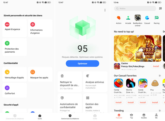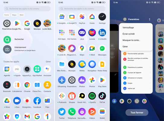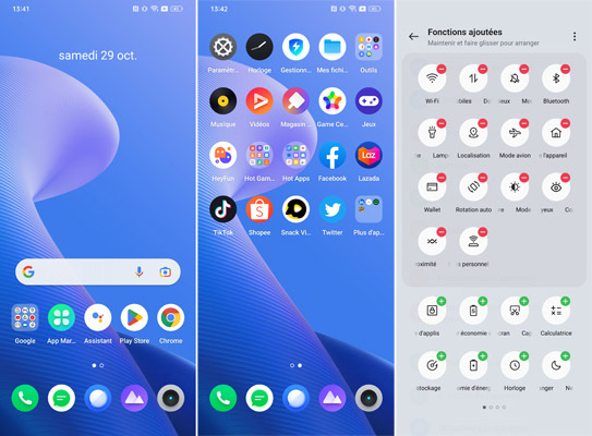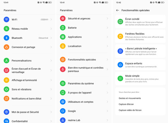 L’interface propose des panneaux d’accueil avec plusieurs raccourcis avec différentes applications avec, sur le volet de gauche, le Google Discovery affichant des actualités selon vos centres d’intérêt. Parmi les fonctionnalités spéciales disponibles ici, on peut compter sur la possibilité de scinder l’écran en deux pour afficher autant d’applications simultanément, les fenêtres flottantes pour afficher une application par-dessus toutes les autres, la barre latérale pour accéder rapidement à certaines applications ou des fonctionnalités du téléphone. L’espace Enfants est également de mise avec la possibilité de proposer une interface simplifiée donnant accès à certaines applications choisies tandis que le mode simple permet d’avoir là aussi une interface particulièrement épurée avec de gros textes, de larges icônes et des sons plus forts. La navigation par gestes est bien entendu possible.