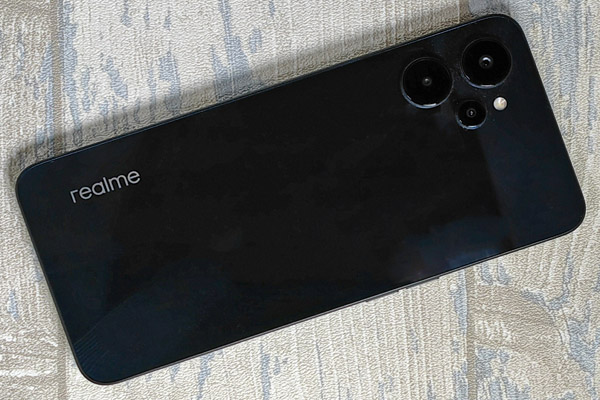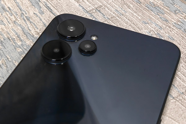 Le design du smartphone realme 9i 5G est assez remarquable pour un modèle d’entrée de gamme. Ses profils sont relativement plats avec des coins tout juste arrondis, ce qu’il faut pour ne pas qu’ils soient saillants et proposent une assez bonne prise en main. Le dos du mobile est totalement plat, d’un très bel effet, les capteurs installés dans le coin supérieur à gauche semblent juste posés dessus, car il n’y a aucune plaque en dessous ni autour ce qui donne un côté très épuré assez agréable à l’œil. C’est un peu le même principe que derrière le très haut de gamme Samsung Galaxy S22 Ultra et du plus abordable Galaxy A13 5G avec lequel le realme 9i 5G entre d’ailleurs en concurrence directe. Il y a donc trois capteurs dépassant légèrement et le flash qui est sur le même plan que le dos. Celui-ci est pailleté. Nous avons pu essayer le modèle noir, mais le realme 9i 5G est aussi décliné en bleu ou en doré.