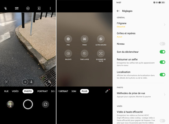 Le realme 9i 5G est parfaitement capable de lire des contenus multimédia avec une définition Full HD étant donné qu’il supporte le protocole Widevine L1. Pour les photos et les vidéos, il est équipé d’un capteur principal de 50 mégapixels ouvrant à f/1.8, un capteur de 2 mégapixels pour les prises de vue en mode macro et un dernier capteur de 2 mégapixels pour optimiser les portraits. Il n’y a donc pas de module pour prendre des photos en ultra grand-angle ici. Inutile de chercher le mode 0,5x ou 0,6x dans l’interface de l’application. Celle-ci se présente de manière très classique avec quelques options en haut de l’écran, la fenêtre de cadrage, les modes zooms ainsi que l’icône pour lancer l’application Google Lens, le bouton virtuel pour appliquer un embellissement de l’image et les modes de prises de vue. De gauche à droite, il y a : Nuit, Rue, Vidéo, Photo, Portrait, 50M et Plus. Ce dernier menu contient les modes Pro, Pano(ramique), Ultra Macro, Ralenti, Time-lapse et Scanner de texte. Il est possible de personnaliser les modes pour faire apparaître dans l’interface principale vos favoris.