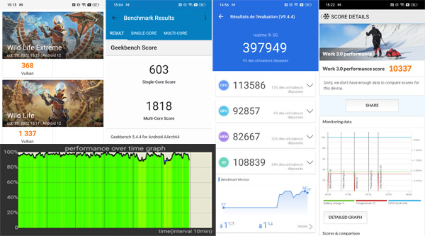 Pour les jeux, il se défend plutôt bien, proposant de jouer avec des graphismes moyens. Nous avons été assez satisfaits de la température produite par le mobile qui reste parfaitement modérée. En outre, on peut constater sur le graphique de CPU Throttling que le chipset reste proche de son plein potentiel pendant presque toute la durée du test (60 minutes) ce qui est une très bonne chose. Afin de comparer les performances brutes du realme 9i 5G aux autres mobiles, nous l’avons soumis à plusieurs outils de mesure dont voici les principaux résultats (en prenant en compte que notre modèle de test disposait de 6 Go de RAM, sans extension).