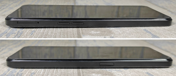 Sur le profil droit, il y a le tiroir pour les cartes SIM dont deux sont supportées simultanément avec la possibilité d’ajouter une carte mémoire en plus, au format micro SD. Juste dessous, il y a deux boutons pour gérer le volume. Celui permettant de baisser le son est indépendant de celui qui sert à mettre plus fort ce qui est une bonne chose pour les identifier plus rapidement. Enfin, sur le profil inférieur, il y a un port audio jack pour brancher un casque, deux microphones, un connecteur USB-C et un haut-parleur. Le mobile propose un son mono. Celui-ci dispose d’un mode Ultra volume qui monte le son à 200%. Ce n’était pas vraiment la peine puisque dans ces conditions, le son est dénaturé, partant un peu dans tous les sens. Une écoute à un volume plus modéré suffit largement pour se rendre compte que l’ensemble sonne plat, sans relief. Bref, l’écoute au casque, via le port audio ou sans fil est à privilégier.