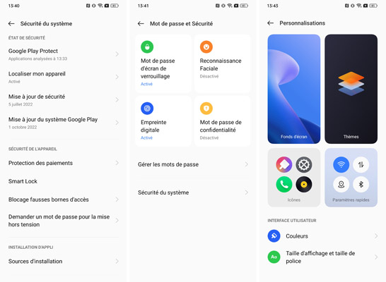 Le realme 9i 5G fonctionne sous Android 12 avec une surcouche logicielle realme UI 3.0. Celle-ci s’apparente beaucoup à celle de la surcouche logicielle développée par Oppo, ColorOS avec de nombreux paramètres en commun dont certains concernent la personnalisation de l’interface. Sur le modèle testé, la mise à jour du système de sécurité datait du 1er septembre 2022 et la mise à jour du Google Play datait du 1er octobre 2022, ce qui est assez récent vu que le test a été effectué mi-octobre. Realme propose 3 ans de mises à jour logicielles pour tous ses mobiles.
