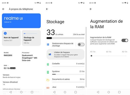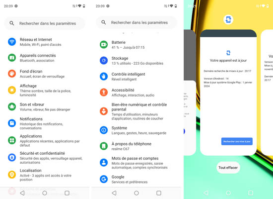Le smartphone realme C67 est animé par Android 14 avec une surcouche logicielle realme UI 4.0. L’interface peut être facilement personnalisée. La navigation par geste est bien entendu possible ou via des touches virtuelles en bas de l’écran. Plusieurs fonctions de raccourcis sont disponibles en tirant le haut de l’écran vers le centre. Plusieurs fonctions spéciales sont disponibles : écran scindé en deux, fenêtres flexibles, barre latérale intelligente, espace enfants et mode simple. C’est bien pour un appareil d’entrée de gamme. Le gestionnaire d’applications permet de passer d’une application à une autre et de faire une capture d’écran.
