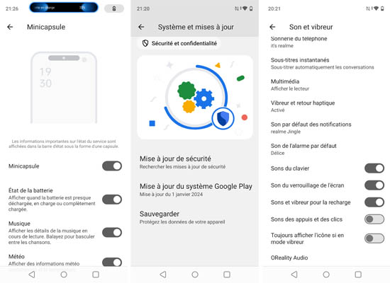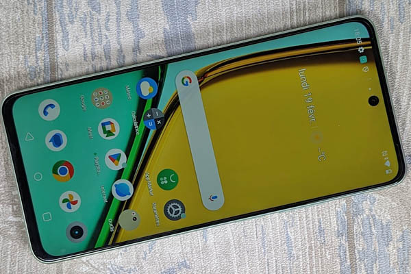 Original, comme le realme C55, ce modèle profite de la fonction Mini Capsule. Il s’agit d’une option qui se veut similaire à la fonction Dynamic Island proposée sur les derniers iPhone autour du capteur photo frontal. Une zone en forme de pilule s’anime de temps à autre pour indiquer le niveau de la batterie, lorsqu’elle devient faible, qu’elle est en cours de chargement, l’utilisation de données ou affiche le nombre de pas ainsi que la distance parcourue pendant une journée. On peut également avoir la météo.