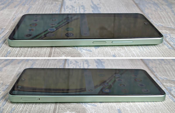 Sur le côté droit, il y a le bouton pour mettre en veille l’appareil qui sert aussi de lecteur d’empreinte digitale. Lors de nos tests, il s’est avéré assez réactif pour proposer une bonne expérience. Il y a également le double bouton pour gérer le volume. Sur le profil gauche, il y a le tiroir à cartes. Celui-ci peut supporter simultanément deux cartes SIM et une carte mémoire pour étendre la capacité de stockage interne de l’appareil. Le tiroir est protégé contre les infiltrations d’eau. Plus généralement, comme le realme C55, mais aussi les concurrents, le mobile peut résister à des éclaboussures, mais sans plus, ce qui est déjà pas mal pour un smartphone d’entrée de gamme trop souvent laissé à la merci des intempéries et autres tracas de la vie.
