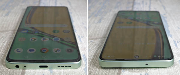 Sur le profil inférieur, il y a le connecteur USB-C, un haut-parleur, un microphone et un port audio jack pour brancher un casque. Le son proposé par le realme C67 est mono. Il est très clair et sans aucune chaleur particulière. Il peut convenir pour des sons du système, voire une courte vidéo, mais s’avère trop criant pour regarder une série, voire plus long. Une écoute au casque est plus satisfaisante.