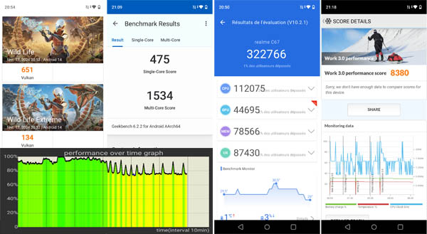 Comme pour les autres mobiles, nous l’avons soumis à plusieurs outils de mesure de performances dont voici les principaux résultats. Notez que le processeur est particulièrement stable tout au long de la phase de test durant 30 minutes puis après, il y a des hauts et des bas, descendant légèrement en dessous des 80% de son plein potentiel.
