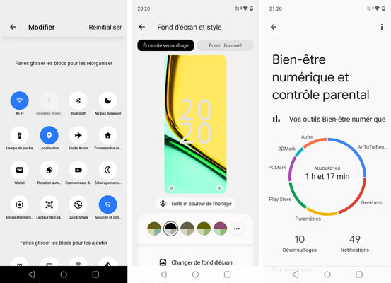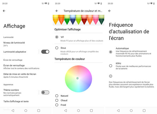 À contrario, dans la pénombre, on profite d’une luminosité suffisante qui reste agréable. La luminosité s’adapte automatiquement aux conditions d’éclairage extérieures. Dans les paramètres, on peut choisir entre les modes Vifs ou Naturels. On peut également moduler la température de couleur de l’écran pour obtenir une teinte plus chaude ou plus froide. Concernant la fréquence de l’écran, on peut choisir le mode automatiquement qui sélectionne la meilleure fréquence selon l’application utilisée (entre 60 et 90 Hz), Elevé pour une fluidité optimale au détriment de la consommation d’énergie ou Standard pour favoriser l’autonomie.