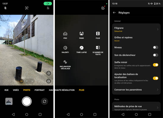 Les modes de prises de vue sont Nuit, Rue, Vidéo, Photo, Haute résolution et Plus. Dans ce dernier menu, on trouve également les modes Pro, Pano(ramique), Film, Ralenti, Time-lapse, Scanner de texte et Inclinaison décalage. Il est possible de personnaliser l’interface pour intégrer l’un des modes proposés au sein du menu Plus avec les autres pour y accéder plus rapidement. C’est toujours pratique.