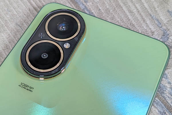 Dans le coin supérieur à gauche, les capteurs photo sont installés en position verticale et inscrits au sein d’une plaque ovale. Celle-ci est noire, tranchant avec le vert de notre modèle de test. Les objectifs sont rehaussés d’un cercle avec un léger ciselage, doré d’un très bel effet. Le bloc dépasse de presque 3 mm, ce qui est assez proéminent, mais, une fois la protection enfilée, cette épaisseur est atténuée. Le dispositif photo étant installé à gauche de l’appareil, lorsqu’il est posé sur une surface plane, il y a irrémédiablement un effet de bascule qui se produit. À l’arrière, on ne retrouve donc pas le côté épuré du Samsung Galaxy A15 4G (ou la version A15 5G) avec lequel le realme C67 est en concurrence.