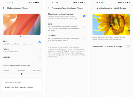 On profite de plusieurs schémas de couleur disponibles : vive, naturel, mode pro avec la possibilité de jouer sur la température des couleurs afin d'adapter le rendu. Celui que nous trouvons le plus pertinent est le mode naturel. À titre de comparaison, le Xiaomi 12 propose aussi un écran AMOLED 120 Hz HDR10+ mais, plus petit, sur 6,28 pouces et avec le support, en plus de la technologie Dolby Vision et un taux d?échantillonnage plus élevé. L?écran du Oppo Find X5 lui est comparable alors que le Google Pixel 6 avec lequel le realme GT 2 Pro entre en concurrence propose une fréquence de seulement 90 Hz sans compatibilité HDR10+. Le Samsung Galaxy S22 qui est un peu plus cher propose, de son côté un écran plus petit, sur 6,1 pouces HDR10+, 120 Hz et avec une définition classique de 1080x2400 pixels donc précis que la dalle du realme GT 2 Pro. La surface d'affichage en façade occupe une très grande partie de l'avant de l'appareil avec des bords assez peu épais sur les côtés et très légèrement plus sur les parties inférieures et supérieures qui sont, à peu près équivalentes.
