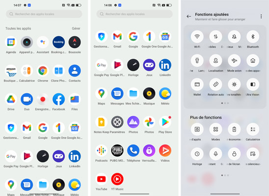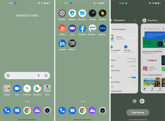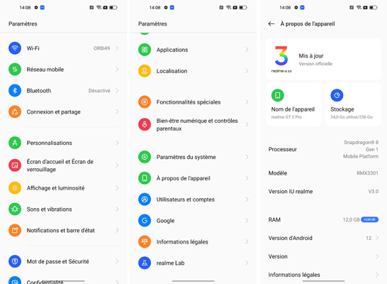 Le realme GT 2 Pro est animé par le système Android 12 avec une surcouche logicielle realme UI 3. Nous avons pu tester l'appareil dans sa version RMX3301_11_A.09. L'interface ressemble beaucoup à celle proposée au sein de ColorOS, le système embarqué sur les mobiles Oppo. Les paramètres sont organisés exactement de la même façon. On a droit à un très bon niveau de personnalisation avec des couleurs qui peuvent être puisées depuis l'image en fond d?écran pour une meilleure harmonisation. Il y a une barre latérale pour accéder rapidement à certaines applications ou fonctionnalités du mobile. Le gestionnaire multitâche permet de voir toutes les applications en cours d'exécution, de fermer certaines et d'en ouvrir d'autres via un écran scindé en deux. On peut changer la forme des icônes et leur style. Le Google Discover est disponible en faisant glisser la page d'accueil vers la droite. Par défaut, plusieurs applications sont installées : Booking.com, Boutique Amazon, Clone Phone, LinkedIn, Notes Keep, PUBG Mobile.