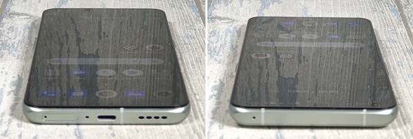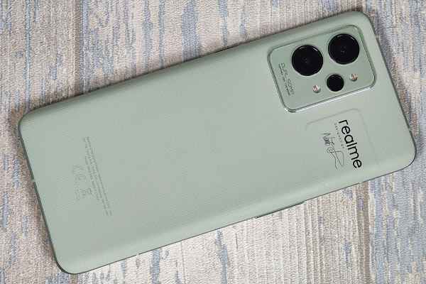 Les profils supérieur et inférieur sont presque plats. Le mobile offre une excellente prise en main. Ce qui est très agréable, c'est le toucher ressenti au dos du smartphone. En effet, celui-ci profite d'un revêtement texturé plutôt doux, antidérapant et totalement anti-traces de doigts. Il s'agit du premier panneau au monde fabriqué à partir d'un biopolymère certifié ISCC et issu d'un an de recherche et développement et plus de 1000 heures de tests de couleur, nous dit la marque. Le nom du designer, Naoto Fukasawa, déjà l'origine du realme GT Master Edition, est inscrit sur la coque arrière, sous le logo de la marque, à côté du bloc optique. Celui-ci est installé sur une plaque qui reprend la couleur du reste du dos du smartphone. Il inscrit les trois capteurs dont deux cercles plutôt imposants à gauche et le capteur pour le microscope encadré par deux flashes. Une mention indiquant « Dual 50MP » affiche les intentions du téléphone. Au dos, le bloc reprend l'organisation des realme GT Neo 2 et realme 9 Pro+ avec lesquels on peut le confondre.