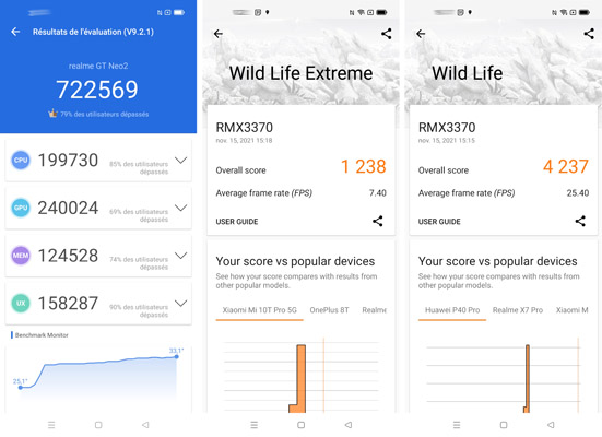 Comme évoqué en introduction, le realme GT Neo 2 embarque une puce Qualcomm Snapdragon 870 compatible 5G et qui propose de très belles performances sur le papier. Dans les faits, après un rapide test de mesure de performances, nous avons effectivement pu constater que le mobile propose un très bon score. Son chipset est accompagné de 8 Go de mémoire vive (notre modèle de test) ou de 12 Go, selon la configuration choisie. Pour aller plus loin, comme les plus récents smartphones de la marque, il est possible d'utiliser la fonction RAM Extended.