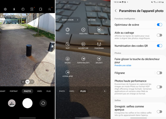 L’interface de l’application est très classique avec plusieurs options disponibles tout en haut de l’écran, la zone de cadrage, les niveaux de zooms (0,6x, 1x et 2x) immédiatement accessibles puis les modes de prises de vue (Amusant, Portrait, Photo, Vidéo et Plus). Le menu Plus permet d’accéder à d’autres modes : Pro, Vidéo Pro, Single Take, Nuit, Nourriture, Panorama, Macro, Super Ralenti, Ralenti, Hyperlapse. Notez l’absence d’un mode double vue pour se filmer en même temps que ce qui est capturé derrière le mobile. Il est possible de personnaliser l’interface avec des modes préférés.