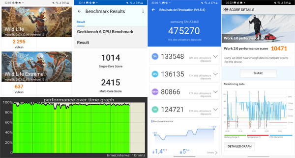 Pour fonctionner, le Galaxy A34 5G utilise le processeur MediaTek Dimensity 1080, comme le Xiaomi Redmi Note 12 Pro 5G. Il est décliné en deux configurations avec 6 Go de mémoire et 128 Go d’espace de stockage (extensibles) ou 8 Go de RAM et 256 Go (aussi extensibles). C’est la première version que nous avons pu tester. Notez qu’il est possible, via le menu RAM Plus, d’ajouter 2, 4 ou 6 Go de mémoire vive virtuelle supplémentaires, le cas échéant. La version embarquant 8 Go peut ajouter jusqu’à 8 Go de RAM virtuelle. Avec son chipset Dimensity 1080 et ses 6 Go de RAM, le mobile testé nous a paru relativement performant. Globalement, l’expérience est plutôt agréable et les animations sont jouées avec une certaine vélocité. Attention, il ne s’agit pas là d’un mobile lent ni ultra performant, mais un appareil qui fait le job, sans débord. On est ravi de savoir que le chipset est capable de proposer tout son potentiel ou presque même après plusieurs dizaines de minutes de tests poussés. L’appareil est tout à fait apte à nous faire jouer avec un certain niveau de détails et une jouabilité relativement agréable et satisfaisante.