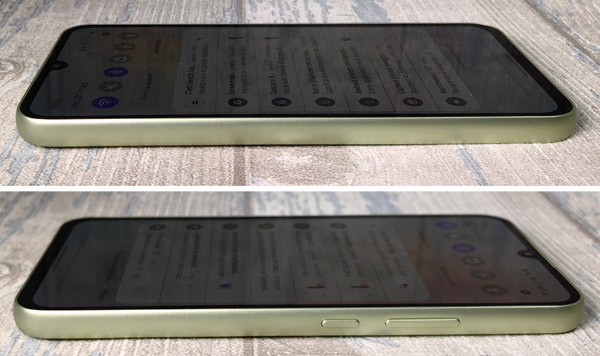 Les profils du smartphone sont de la même couleur de sa partie arrière. Ils sont légèrement bombés, comme son prédécesseur, le Galaxy A33 5G. On peut compter sur une épaisseur de 8,2 mm contre 8,1 mm précédemment. Le Galaxy A34 5G est plus large que le Galaxy A33 5G proposant une mesure de 78,1 mm contre 74 mm. Il est aussi très légèrement plus haut. En outre, il a pris du poids puisque le nouveau modèle fait 199 grammes contre 168 grammes pour le Galaxy A33 5G. Le Galaxy A34 5G partage le même chipset que le Xiaomi Redmi Note 12 Pro 5G (et aussi que le Redmi Note 12 Pro+ 5G) et par rapport à celui-ci est plus épais et plus lourd aussi (7,9 mm de profil et 187 grammes pour le Redmi Note 12 Pro 5G).