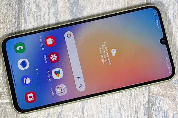 À chaque nouvelle génération, Samsung propose une amélioration au niveau de l’écran. C’est ici le cas puisque le Galaxy A33 5G avait un écran de 6,4 pouces alors que celui du Galaxy A34 5G fait 6,5 pouces en diagonale. Il y a une encoche au niveau du capteur photo frontal. On peut compter sur une définition de 1080x2400 pixels et une fréquence de rafraîchissement de 120 Hz au maximum contre du 90 Hz sur le Galaxy A33 5G donc proposant des défilements moins fluides. Il s’agit toujours d’une dalle AMOLED. Samsung annonce une luminosité maximale de 1000 cd/m², en activant le mode Super lumineux contre 800 cd/m² pour l’écran du Galaxy A33 5G. Cela lui permet d’être utilisé en extérieur, sans aucun problème. En outre, on apprécie également sa faible luminosité, dans la pénombre permettant ainsi d’être utilisé en toutes circonstances. L’écran est totalement plat avec des bords assez épais. C’est surtout celui du menton qui est le plus large. En outre, sur notre modèle de test, nous avons remarqué que les bords gauche et droit n’étaient pas exactement de la même largeur, comme si l’écran n’était pas parfaitement centré. Cela se joue sur une mesure inférieure au millimètre, mais cela se voit un peu quand même. Cette remarque est surtout valable sur la partie haute de l’écran. Sur la partie basse, les deux bords semblent aussi épais l’un que l’autre.
