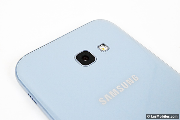 Autre conséquence, la tranche inférieure est maintenant moins fournie : le port jack 3,5 mm est maintenant le seul à accompagner le micro principal et le port USB, ici de type-C. Vous noterez que c'est la première fois que Samsung utilise cette connectique dans la série A (nous le retrouverons aussi dans le A3 (2017) évidemment). À l'opposé, sur la tranche supérieure, se trouvent le tiroir pour la carte mémoire et le micro secondaire. La façade avant est très commune, avec l?écran et le bouton mécanique (avec lecteur d'empreinte) assorti de deux surfaces tactiles pour la navigation dans Android. À l'arrière, le capteur photo est accompagné d'un flash. Ce dernier est moins protubérant que dans le Galaxy A5 (2016).