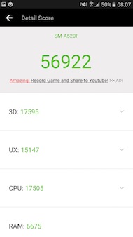 Les scores graphiques de l?Exynos 7880 sont d'ailleurs très intéressants, parce qu'ils placent le Galaxy A5 (2017) bien au-dessus de sa véritable catégorie, malgré le fait que le chipset adopte un tri-core ARM Mali-T830, un GPU plutôt modeste. Son score égalise l?Adreno 506 de Qualcomm, voire le dépasse dans certains cas. Et nous nous demandons pourquoi. La réponse vient peut-être du Game Launcher qui offre plus de panache aux jeux et à certains outils de benchmarks.