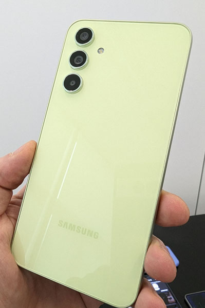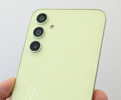 Comme évoqué un peu plus haut, le Galaxy A54 5G profite du design épuré de la série S23 avec des capteurs photo qui semblent juste posés sur le revêtement à l’arrière de l’appareil. Le dos est totalement plat avec des coins très arrondis, plus que sur le précédent modèle. Le dos est en verre et réfléchit pas mal la lumière. Le smartphone est décliné en graphite, blanc, lavande et lime et laisse quelques traces de doigts sur la partie arrière.