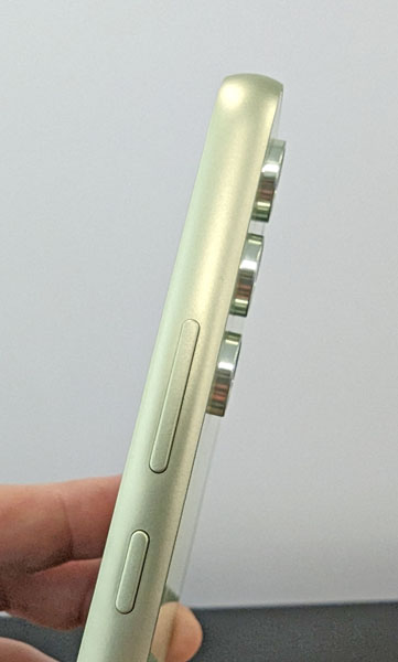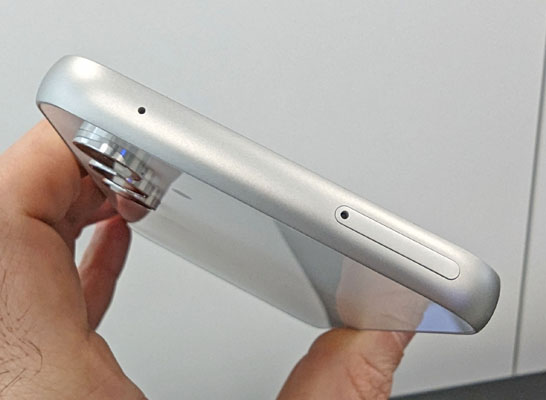 C’est sur le profil supérieur que l’on trouve le tiroir à cartes SIM et notez également la présence d’un troisième microphone. Rappelons que le mobile est le premier de la série A à être compatible avec la technologie eSIM, ce qui peut être pratique.